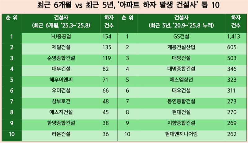 "아파트 하자 폭탄, 20개 건설사 공개…HJ중공업 154건 ‘최다’, GS·대우·현대도 포함"