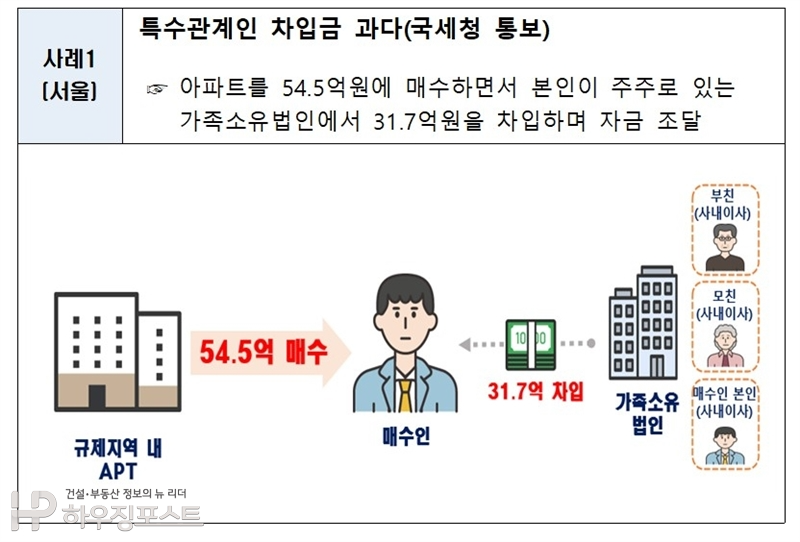 국토부 부동산소비자보호기획단은 올해 3~4월 서울지역 주택 이상거래 조사에서 위법의심 거래 317건(376건의 위법의심 행위)을 적발했다고 밝혔다. 법인 자금을 빌려 고가 아파트를 매수한 특수관계인 거래를 비롯해 ▲기업운전자금 대출을 개인 부동산 구입에 전용한 사례 ▲부모를 임차인으로 둔 편법증여 계약 ▲거짓 신고를 통한 다운계약 등이 대표적이다.