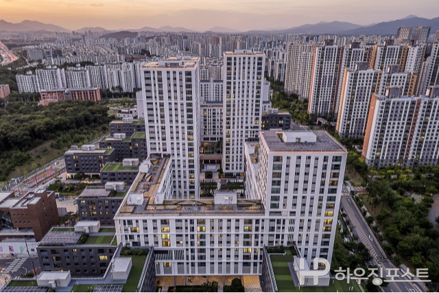 서울 강동구 ‘e편한세상 고덕 어반브릿지(E-Pyunhansesang Godeok Urban Bridge)’ 아파트 단지 전경. 단지와 도시를 연결한다는 콘셉트로 설계돼, 저층부 브릿지와 옥상정원을 통해 입주민 간 소통과 커뮤니티 활성화를 유도했다. 2025 한국건축문화대상 주택부문 대통령상을 수상했다. (사진=시아플랜건축사사무소·사진작가 홍성준 제공)