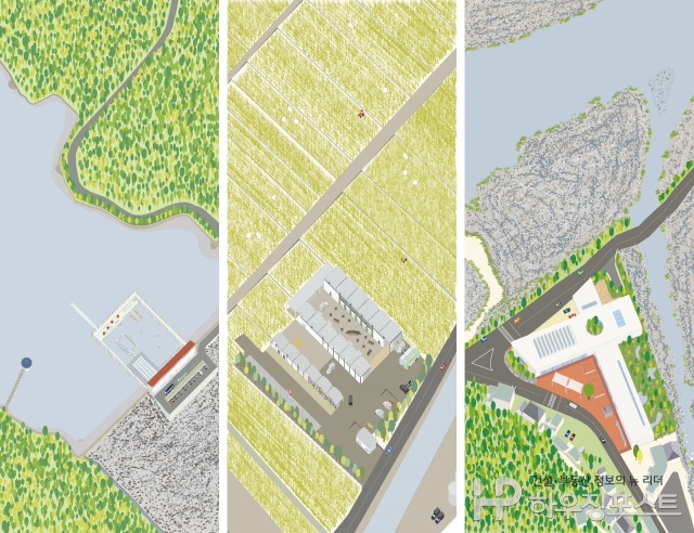 염선웅 홍익대학교 학생의 ‘A Moment of Village: 구례 마을형 휴게소’ 설계 이미지. 자연형·산업형·커뮤니티형 휴게소로 구성된 이 작품은 저수지·밀밭·마을길 등 지역 경관과 어우러지는 구조를 제안해, 일상의 공간을 여행의 거점으로 확장했다. (사진=염선웅 제공)