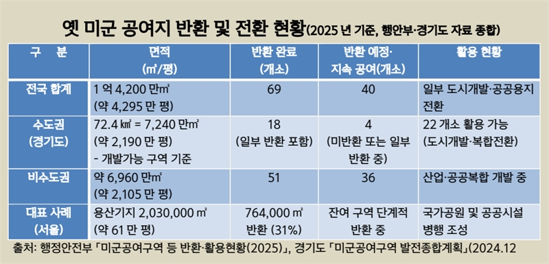 현재 반환 부지는 총 1억4,247만㎡(약 4,320만 평)에 달하며, 이 가운데 경기북부 지역이 약 80%인 1억1,237만㎡(약 3,400만 평)을 차지한다. 파주·동두천·의정부·연천 등 32개 지역이 주요 후보지로 검토되고 있으며, 정부는 이 지역을 수도권 주택공급 확대의 새로운 거점으로 삼을 방침이다.