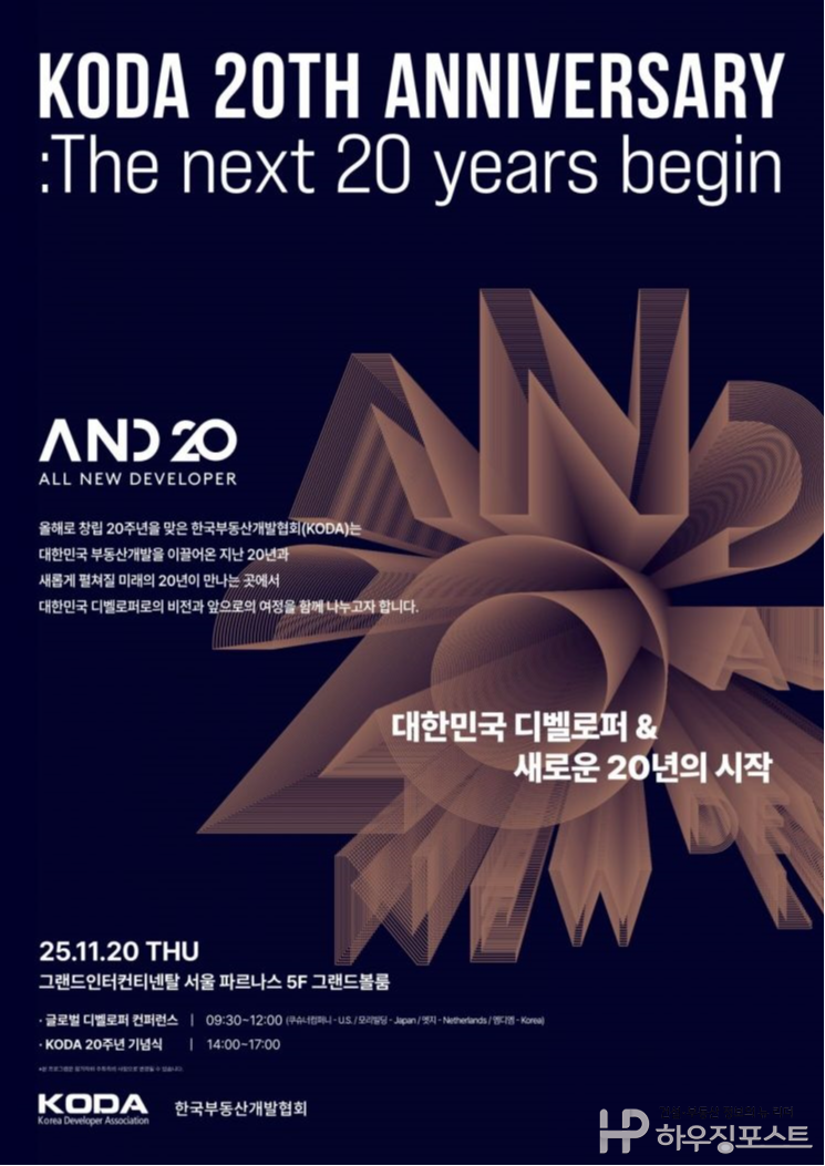 한국부동산개발협회(KODA)가 20일 창립 20주년을 맞아, 기념행사 ‘A.N.D 20(ALL NEW DEVELOPER PROJECT 20)’을 열고, 향후 20년간 협회가 지향할 공공성·투명성 중심의 새 비전을 공식 발표한다. 국내·외 주요 글로벌 디벨로퍼 경영진이 참여하는 콘퍼런스와 새로운 CI 공개, 독립 연구기관 출범 등의 긁직한 이벤트를 선보일 예정이다.