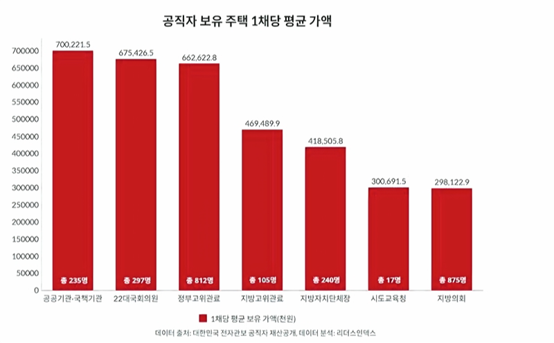 공직자 보유 주택 1채당 평균 가액 현황. 직군별 평균 보유 가액은 공공기관·국책기관 700,221원, 22대 국회의원 675,426원, 정부 고위관료 662,622원 순으로 높게 나타났다. (자료=리더스인덱스)