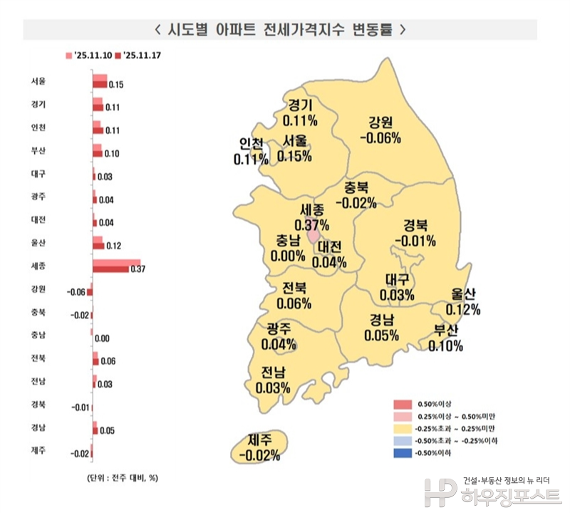시도별 아파트 전세가격지수 변동률(11월 셋째 주 기준). 서울은 0.15% 상승하며 3주째 오름세를 유지했고, 경기(0.11%)·인천(0.11%)도 동반 상승했다. 세종은 0.37%로 전국에서 가장 높은 상승폭을 기록했다. 반면 강원(-0.06%)·제주(-0.02%) 등 일부 지역은 하락 흐름을 보였다. (자료=한국부동산원)