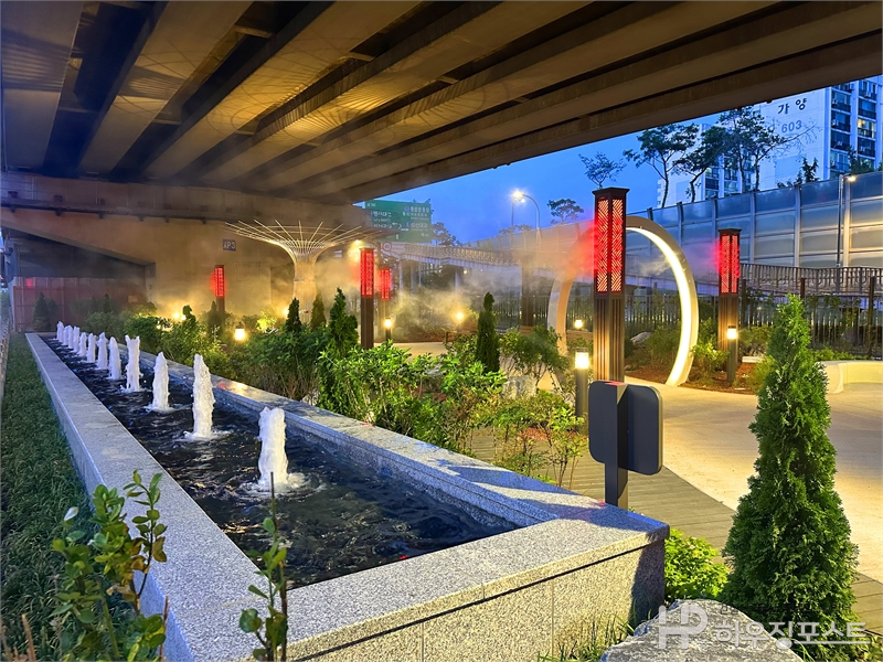 서울시 강서구 고가 하부 물빛정원. 낮은 활용도의 구조물 하부 공간을 정원과 분수, 조명 시설로 재구성한 사례다. (사진=서울시)