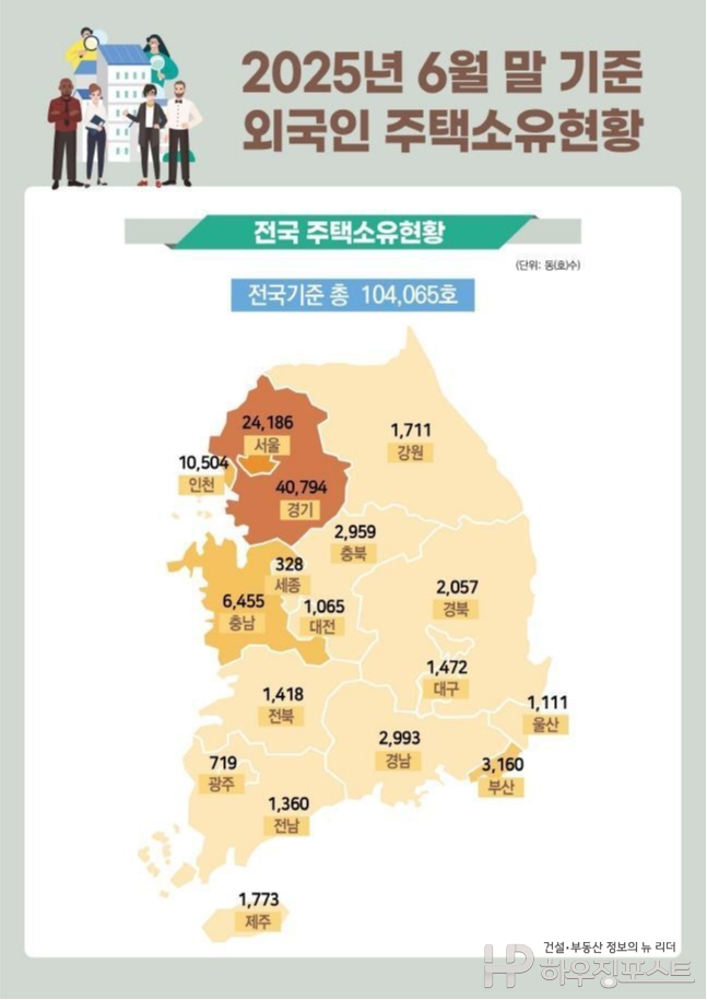 6월 말 기준 외국인 주택소유 현황 인포그래픽. 외국인 보유주택은 전국 104,065호로 집계됐으며, 경기 4만794호·서울 2만4,186호·인천 1만504호 등 수도권 집중도가 72.5%를 차지한다. 증가율은 3.8%로 직전 대비 완만한 흐름을 보였다. (자료=국토교통부)