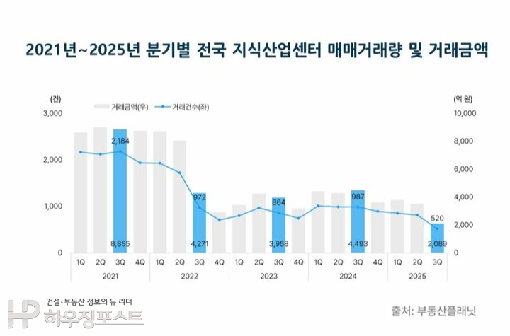 부동산플래닛 집계에 따르면 3분기 전국 지식산업센터 거래량은 520건으로 나타났다. 전년 동기(987건) 대비 47.3% 줄었다. 거래금액도 2,089억원으로 1년 전보다 53.5% 감소했다. 통계가 공개되기 시작한 2021년 이후 최저치라는 평가가 있다.