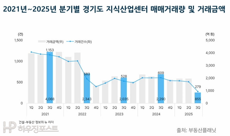 2021년~2025년 분기별 경기도 지식산업센터 매매거래량과 거래금액 추이. 2025년 3분기 거래량은 279건, 거래금액은 855억원으로 전년 대비 큰 폭의 감소세를 나타냈다. (자료= 부동산플래닛)