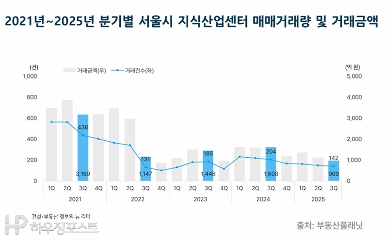 2021년~2025년 분기별 서울 지식산업센터 매매거래량과 거래금액 추이. 2025년 3분기 거래량은 142건, 거래금액은 969억원으로 전년 대비 감소세가 이어졌다. (자료= 부동산플래닛)