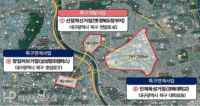 대구 도심융합특구 위치도. 옛 경북도청 부지와 경북대 일대를 중심으로 산업혁신거점·인재육성거점·창업허브거점이 연계 조성된다. 대구 도심에 산업·주거·교육 기능을 집적해 ‘직·주·락’ 혁신 거점으로 육성하는 것이 목표다. (자료: 대구시)