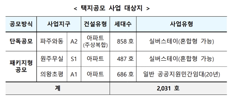 민간제안 공모는 총 4천 가구 규모로, 이 가운데 3천 가구는 일반형, 1천 가구는 실버스테이로 공급된다. 택지공모는 약 2천 가구 규모로, 파주와동 A2, 원주무실 S1, 의왕초평 A1 등 3개 사업지가 대상이다. 이 가운데 일부 사업지는 실버스테이와 일반형을 혼합해 조성할 수 있다.