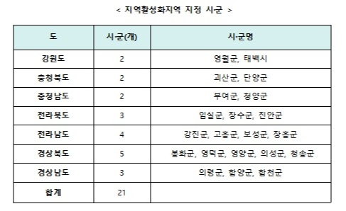 ◆ 7개 도 21개 시·군 ‘지역활성화지역’ 지정