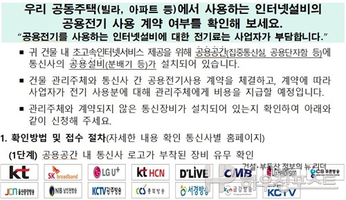 인터넷 설비에 사용되는 공용 전기료는 원칙적으로 서비스 제공 사업자가 부담하도록 사업자별 규정에 명시돼 있다. 다만 실제 현장에서는 공용전기 관리주체가 명확하지 않다는 이유로 정산이 이뤄지지 않으면서, 관리비를 통해 입주민이 비용을 대신 부담하는 사례가 적지 않았다는 지적이 제기돼 왔다.
