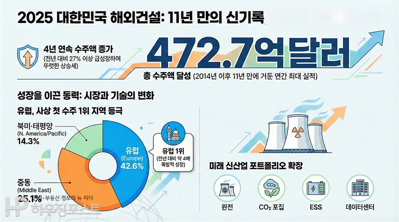 2025년 건설업계 해외건설 수주 실적 및 추이. 작년 해외건설 총수주액은 472억7,000만 달러로 11년 만에 최대치를 기록했다. 체코 두코바니 원전 수주를 계기로 유럽 시장 비중이 급확대되며, 중동 중심이던 수주 구조가 유럽·에너지 중심으로 전환되는 흐름이 뚜렷해졌다. (그래픽=하우징포스트 디자인팀, Ai플랫폼)