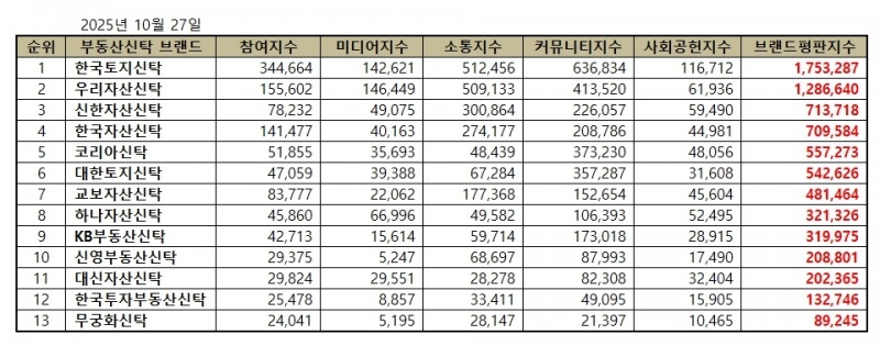 [하우징포스트=유승찬 기자] 10월 부동산신탁업계 브랜드평판 조사 결과, 한국토지신탁이 1위를 차지했다. 한국기업평판연구소가 지난달 27일부터 한달간 13개 신탁사를 대상으로 실시한 분석에서 한국토지신탁은 참여·소통·커뮤니티 지표에서 모두 높은 점수를 기록했다. 우리자산신탁과 신한자산신탁이 각각 2위와 3위로 뒤를 이었다. 한국기업평판연구소는 27일 “국