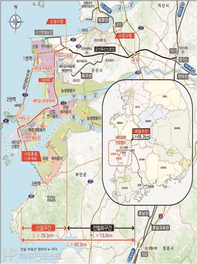 [하우징포스트=오명근 기자] 국토교통부가 12일 새만금항 인입철도 건설사업의 기본계획을 확정·고시했다. 새만금 신항만과 익산을 48.3km 철도로 연결하는 이 사업은 2033년 하반기 개통을 목표로 추진되며, 서해안 생활·물류축을 강화하는 기반 인프라로 평가된다. ◆ 48.3km 단선전철…전액 국비 1조5,859억원 투