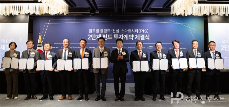 [하우징포스트=임재인 기자] 정부와 공공기관이 민간과 협력해 해외 수주와 수출을 지원하는 1조1천억원 규모의 정책펀드 조성이 본격화된다. 국토교통부는 25일 오전 서울의 한 호텔에서 ‘글로벌 플랜트·건설·스마트시티(PIS) 2단계 펀드’의 공공기관 투자계약 체결식을 개최했다. 이번 체결식에는 해외투자개발, 인프라, 수출