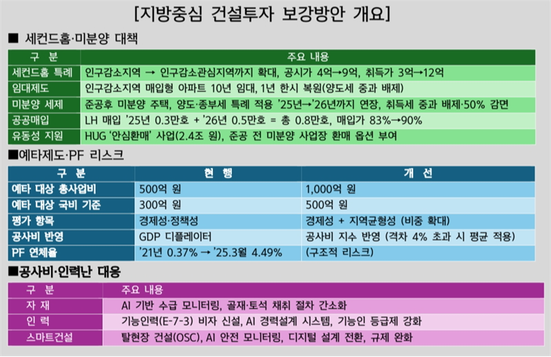 [하우징포스트=박영신 대기자] 정부가 14일 발표한 ‘지방중심 건설투자 보강방안’은 세컨드홈 세제지원 확대, 지방 미분양 해소, 예타제도 개편, 공사비 부담 완화 등 총 56개 과제를 담은 종합 대책이다. 일부 과제는 발표 즉시 시행에 들어가고, 예타 기준 상향이나 해외 숙련인력 도입처럼 법·제도 개정이 필요한 과제는