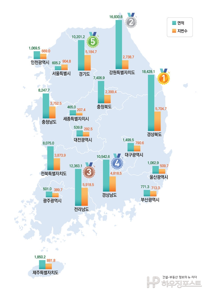 [하우징포스트=박영신 대기자] 지난해 말 기준 우리나라 국토면적이 전년보다 10.5㎢ 늘어난 것으로 집계됐다. 여의도 면적의 3.6배에 해당하는 규모로, 인천경제자유구역 매립과 전남 택지개발 등 지속적인 토지개발사업이 증가의 배경으로 꼽힌다. 도시화가 확산되며 집합건물 대지, 공장, 교통시설 등은 확대된 반면, 농지와 임