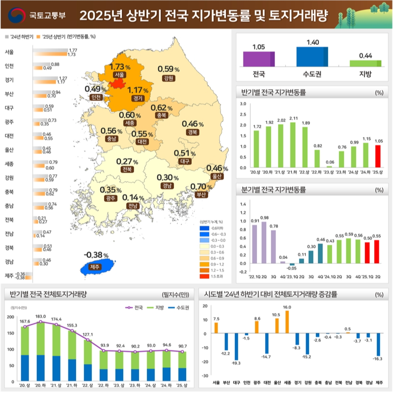 [하우징포스트=박영신 대기자] 국토교통부는 25일 올해 상반기 전국 땅값이 평균 1.05% 상승했다고 밝혔다. 지난해 하반기(1.15%)보다 상승폭이 0.10%포인트 줄며 안정 흐름을 이어갔고, 같은 기간 토지거래량도 4.2% 감소해 거래 위축이 나타났다. ◆ 전국 지가 1.05% 상승…안정 흐름 유지 올해 상반기 전국