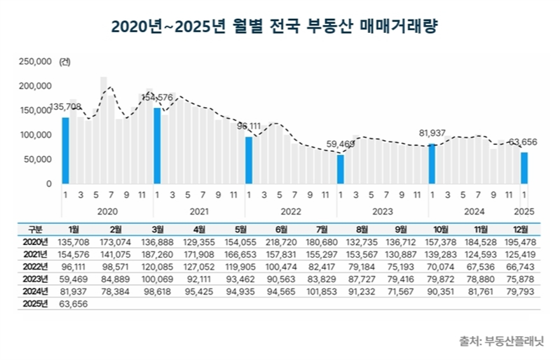 [하우징포스트=박영신 대기자] 올해 1월 전국 부동산 시장이 전반적으로 위축된 가운데, 서울 아파트 거래만 증가하는 차별화된 흐름이 나타났다. 부동산 정보업체 부동산플래닛이 20일 국토교통부 실거래가 자료를 분석한 결과, 전국 부동산 거래량은 6만3,656건으로 전월 대비 20.2% 감소했으며, 거래 금액도 26.5% 줄