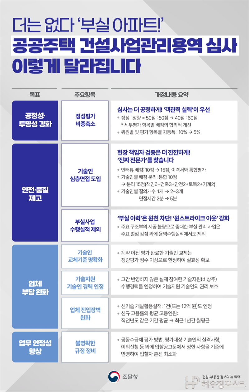[하우징포스트=오명근 기자] 조달청이 공공주택 건설현장의 입찰 비리와 부실공사 차단을 위해 심사 규정을 전면 개편했다. 정성평가 비중을 줄이고 기술인 심층면접을 강화하는 한편, 과거 부실 이력이 있는 업체는 실적 평가에서 제외된다. 새 제도는 10일부터 시행된다. ◆ 건설사 선정 기준 전면 개정 조달청은 8일 정부대전청