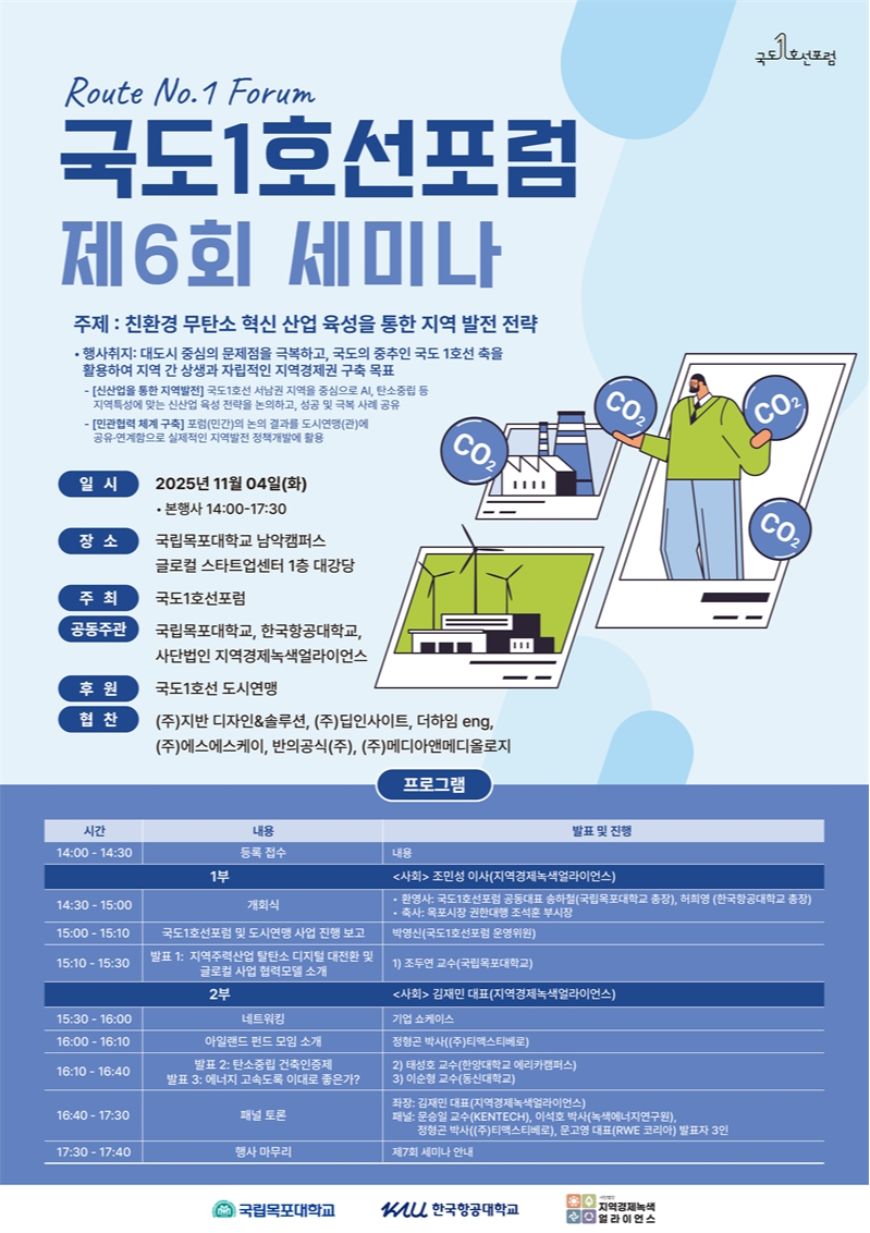 [하우징포스트=오명근 기자] 국도1호선포럼이 11월 4일(화), 국립목포대학교 남악캠퍼스 글로컬 스타트업센터 1층 대강당에서 제6회 세미나를 개최한다. 이번 세미나는‘친환경 무탄소 혁신산업 육성을 통한 지역발전 전략’을 주제로 열린다. 국도1호선포럼이 주최하