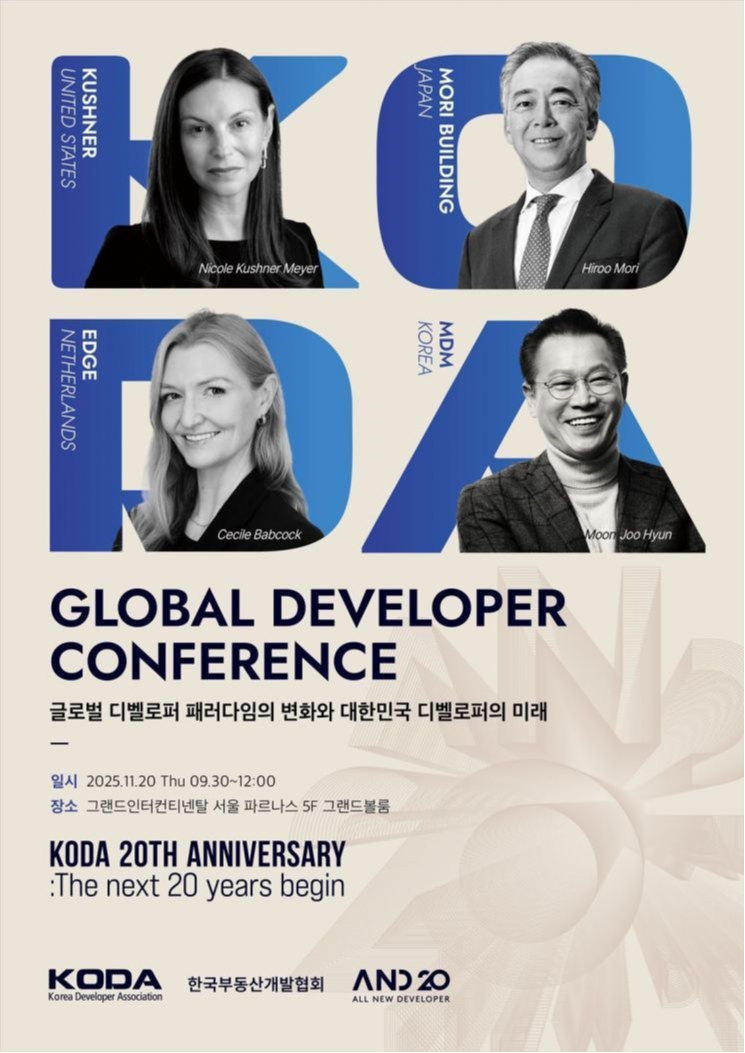 [하우징포스트=박영신 대기자] 한국부동산개발협회(KODA)가 20일 창립 20주년을 맞아, 기념행사 ‘A.N.D 20(ALL NEW DEVELOPER PROJECT 20)’을 열고, 향후 20년간 협회가 지향할 공공성·투명성 중심의 새 비전을 공식 발표한다. 국내·외 주요 글로벌 디벨로퍼 경영진이 참여하는 콘퍼런스와 새로