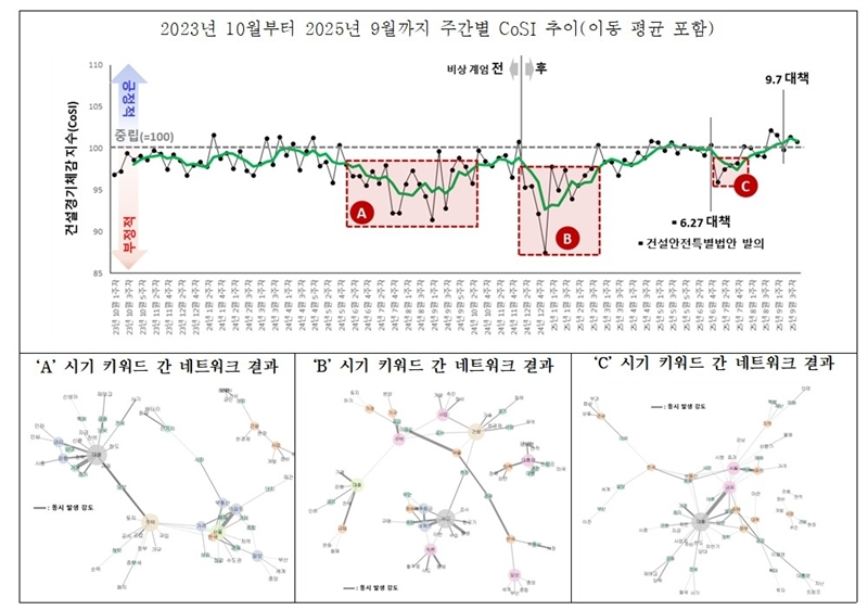 [하우징포스트=오명근 기자] 한국건설산업연구원이 언론 빅데이터를 기반으로 건설경기 체감 흐름을 계량화한 ‘건설경기체감지수(CoSI)’를 공개했다. 최근 1년간 2,300만개 단어를 분석한 결과 금융·대출·주택 관련 키워드가 반복 연결되며 체감경기의 하방 흐름을 이끄는 구조가 확인됐다는 분석이 제기된다. ◆ 2,300만
