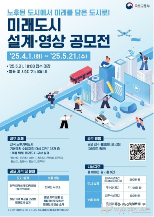 [하우징포스트=김지민 기자] 국토교통부가 노후화된 신도시의 미래 모습을 국민과 함께 그린다. ‘미래도시 설계·영상 공모전’을 통해 창의적 아이디어를 공모한다. 공모전은 4월 1일부터 5월 21일까지 접수하며, 도시설계와 숏폼 영상 두 부문으로 진행된다. 국토부는 전국 노후계획도시의 정비사업이 본격화되는 시점에서, 각 지역