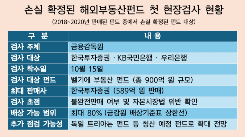 [하우징포스트=박영신 대기자] 금융감독원이 해외부동산 펀드 손실 사태와 관련해 첫 현장검사에 나섰다. 지난 2018~2020년 대규모로 팔린 해외부동산 펀드 중 손실이 확정된 상품을 대상으로 판매 과정의 불완전판매 여부를