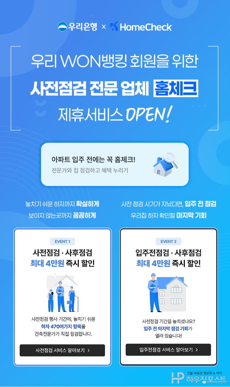 [하우징포스트=문승용 기자] 우리은행이 15일 건축점검 전문업체 홈체크(HomeCheck)와 제휴해 아파트 입주 전·후 하자 점검 서비스를 시작했다. 이번 서비스는 입주 과정에서 발생할 수 있는 하자를 조기에 발견해 고객의 시간·비용·분쟁 부담을 줄이기 위한 생활