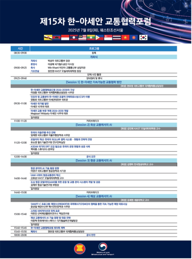 [하우징포스트=임재인 기자] 국토교통부는 8일 서울에서 ‘제15차 한·아세안 교통협력포럼’을 열고, 아세안 10개국과 함께 인공지능(AI)을 활용한 스마트 모빌리티 전략을 본격 논의했다. 올해 포럼은 ‘AI 기반 솔루션을 통한 더 스마트하고 안전한 교통 실현’을 주제로 3일간 열린다. 자율주행과 스마트 인프라 등 한국의
