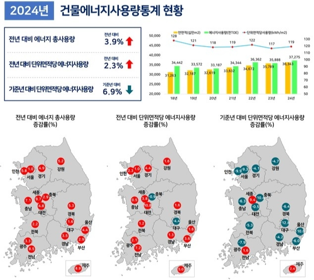 [하우징포스트=임재인 기자] 국토교통부가 지난해 전국 건물 에너지 사용량과 함께 건물 용도별·지역별 단위면적당 에너지 사용량 표준값(원단위)을 처음 공개했다. 총사용량은 폭염·열대야 영향으로 전년보다 3.9% 늘었지만, 기준년(2018년) 대비 단위면적당 사용량은 6.9% 줄었다. 정부는 이번 지표를 바탕으로 맞춤형 절감