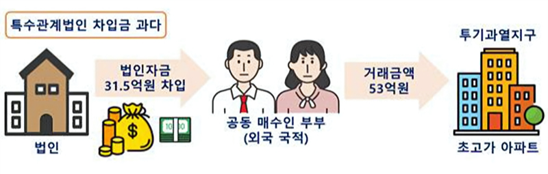 서울의 투기과열지구에서는 외국 국적의 한 부부가 53억 원 상당의 아파트를 매수하면서 특수관계 법인을 활용한 정황이 포착됐다. 남편은 자신이 대표로 있는 법인에서 자금을 빌렸고, 부인은 동일 법인에서 추가 대출을 받아 매수 대금 중 31억 5,000만 원을 충당했다. 매수 대금의 60% 이상이 법인 자금으로 이루어진 데다, 부인은 부모로부터 편법증여를 받은 정황이 드러나 국세청에 통보됐다.