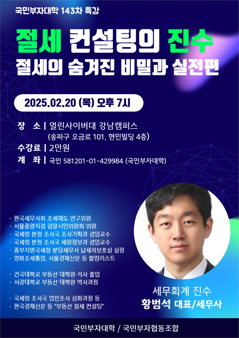 저녁 7시에는 국민부자대학 제143차 특강으로 ‘절세 컨설팅의 진수’ 강의가 열린다. 황범석 세무사가 강연자로 나서 부동산 절세의 핵심 전략과 실전 적용 사례를 소개할 예정이다. 황 세무사는 국세청 조사국에서 조사기획과 및 세원정보과 겸임교수를 역임했고, 부동산 절세 분야에서 다양한 경험을 쌓아온 전문가다.