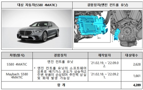 벤츠 S580 4MATIC은 엔진 제어장치 소프트웨어 오류로 화재 발생 가능성이 확인됐다. 리콜은 3월 7일부터 진행되고 있다.