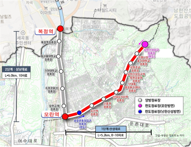 성남~복정 광역 BRT 사업은 성남시 남한산성입구에서 서울 복정역까지 총 10.2km를 연결하는 사업이다. 이번 1단계 구간은 성남시 모란역에서 남한산성입구까지 5.2km 구간으로, 전용 BRT 도로와 정류장이 구축된다. 2단계(5.0km)는 추후 추진될 예정이다.