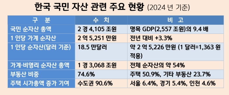 분석에 따르면, 자산의 분포와 구조를 개선하지 않는 한 ‘1인당 2억5,000만원 시대’라는 수치 성과는 삶의 질 향상으로 이어지지 못한 채, '체감 없는 통계'로 남을 수 있다.