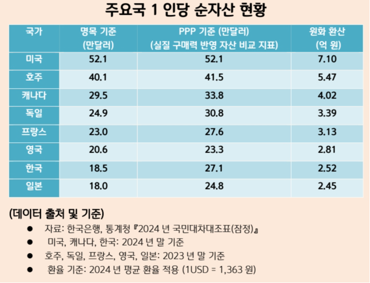 한국은행과 통계청이 17일 발표한 ‘2024년 국민대차대조표(잠정)’에 따르면, 지난해 말 기준 국민 1인당 가계 순자산은 2억5,251만원으로, 전년 대비 3.3% 증가했다. 달러 기준으로는 약 18만5,000달러(환산 약 2억5,226만원)이며, 일본(18만 달러·약 2억4,534만원)을 3년 연속 앞질렀다.