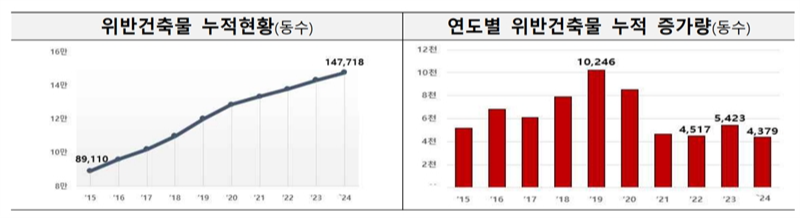 위반건축물 누적 현황과 연도별 증가량. 전국 위반건축물은 2015년 8만9,110동에서 2024년 14만7,718동으로 늘었으며, 매년 5천~6천동씩 증가세가 이어졌다. (자료=국토부)