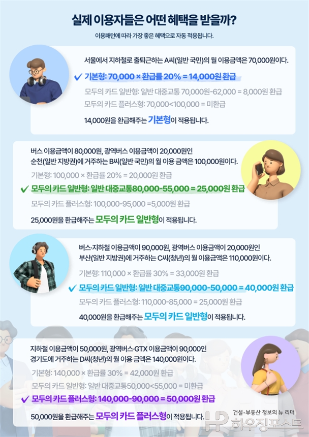 무제한 대중교통 정액패스 K-패스 '모두의 카드' 환급 예시.대중교통 이용 금액과 유형에 따라 기존 K-패스와 ‘모두의 카드(일반형·플러스형)’ 가운데 환급액이 가장 큰 방식이 자동 적용된다. 서울·부산·경기 등 지역과 이용 패턴별로 환급 결과가 달라질 수 있다. (자료=국토교통부)