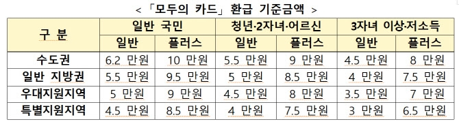 ‘모두의 카드’는 지역과 이용자 유형에 따라 환급 기준금액을 차등 적용해, 월 교통비가 기준을 넘을 경우 초과분을 환급하는 구조다. 수도권·일반 지방권·우대지원지역·특별지원지역으로 구분되며, 일반형과 플러스형에 따라 기준금액이 달라진다. (자료=국토교통부)